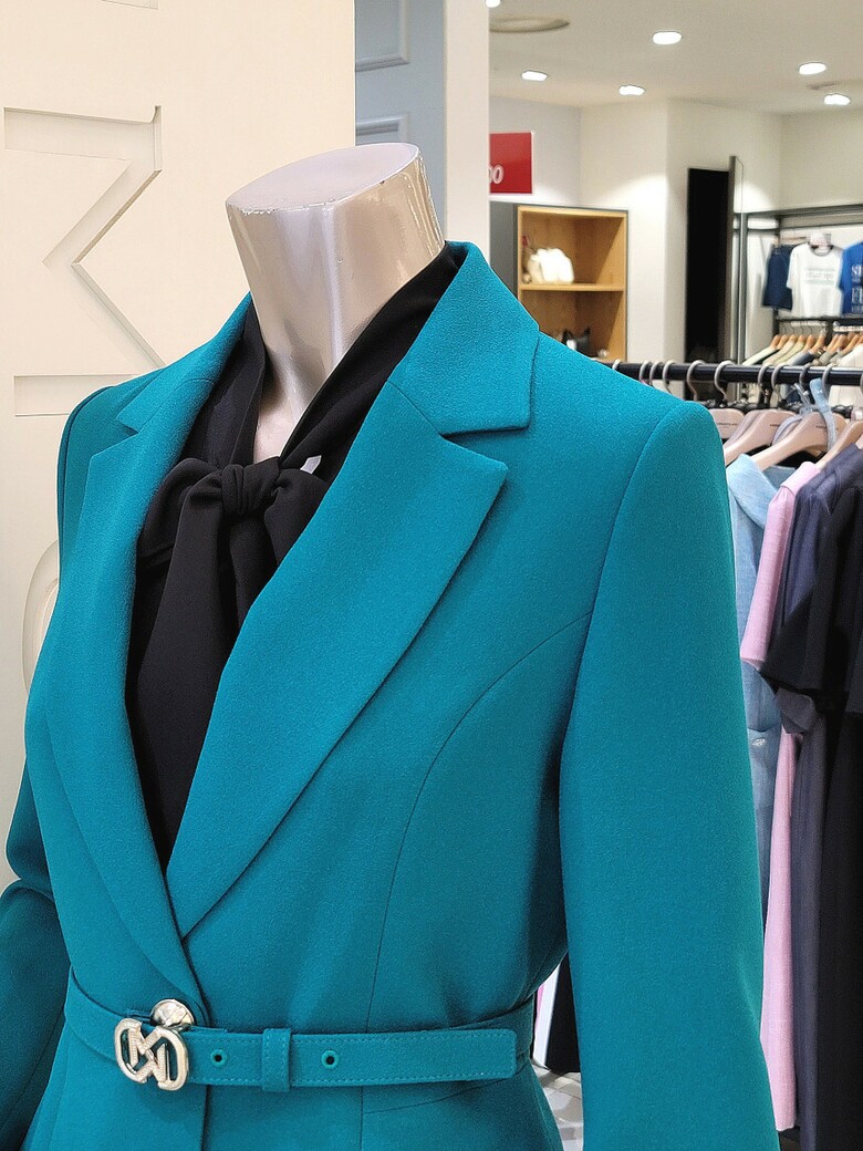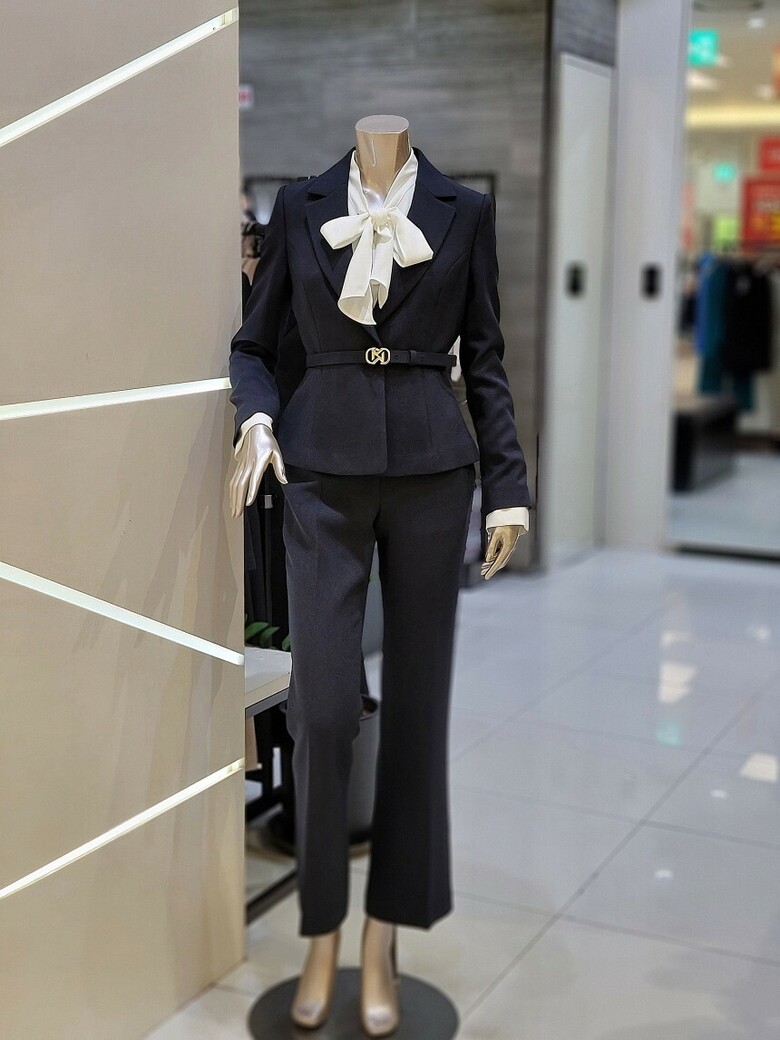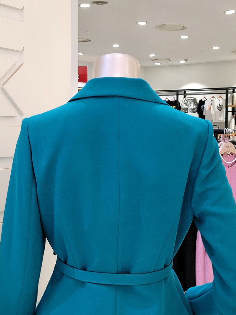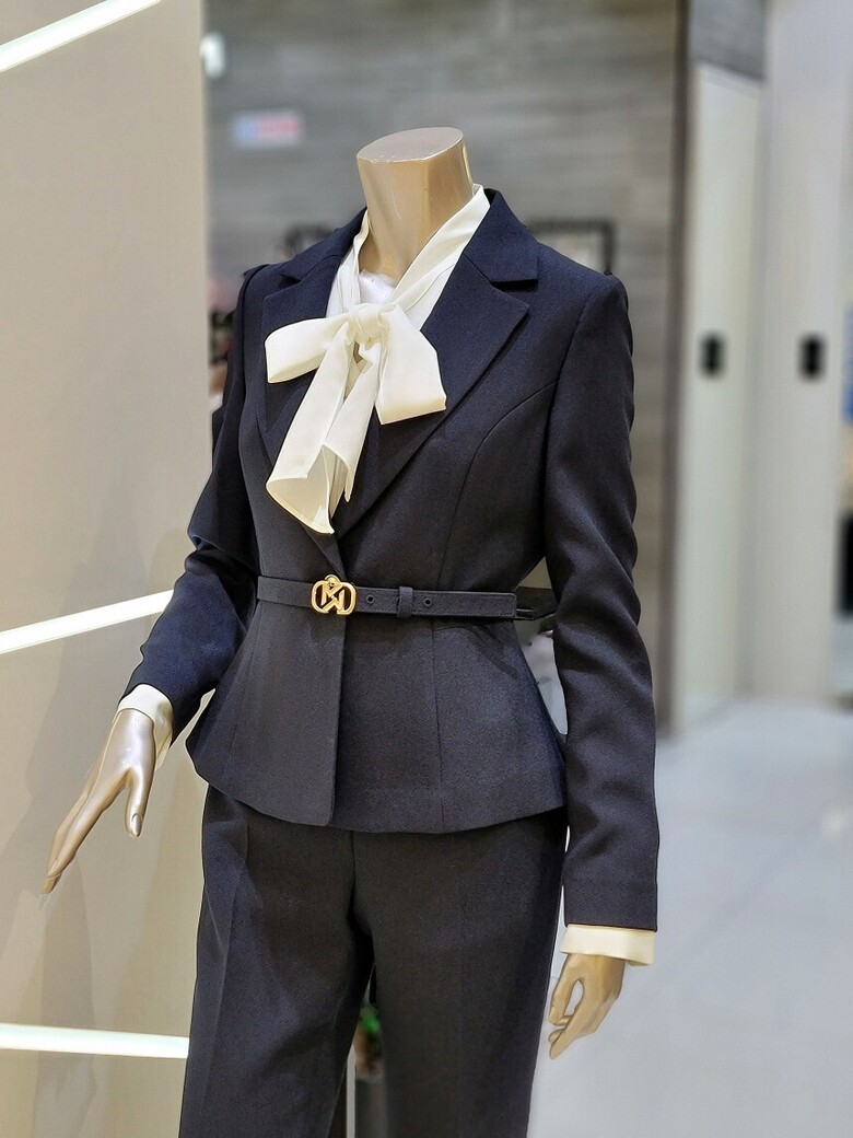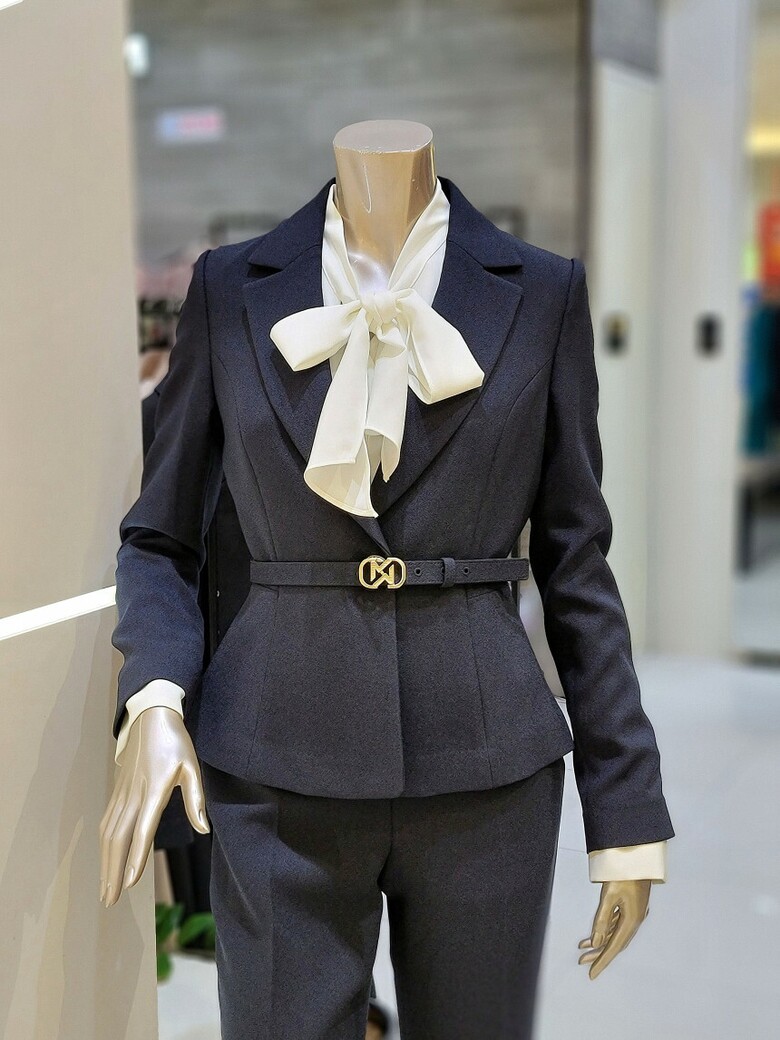 오픈칼라로 네크 맵시를 한층 더하며 슬림한 허리 핏의