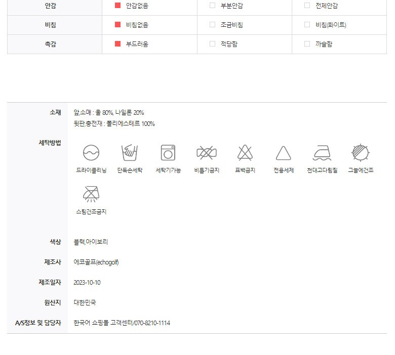 1. 제품 소재 (섬유의 조성 또는 혼용률을 백분율로 표시, 기능성인 경우 성적서 또는 허가서) 상품 이미지 참조