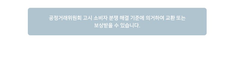 상품불량에 의한 반품, A/S, 품질보증 및 피해보상 등에 관한 사항은 소비자 분쟁해결기준(공정거래위원회 고시) 구매자가 미성년자인 경우에는 상품 구입시 법정대리인이 동의하지 아니하면 미성년자 본인 또는 법정대리인이 구매취소 할 수 있습니다. |