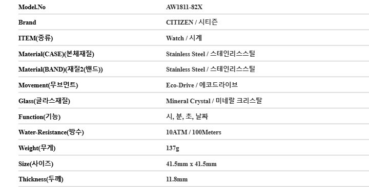 7. 주요 사양 | 스테인리스스틸 시계 에코드라이브 |