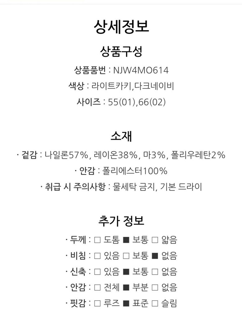 | 6. 세탁방법 및 취급시 주의사항 | 상품상세참조 |