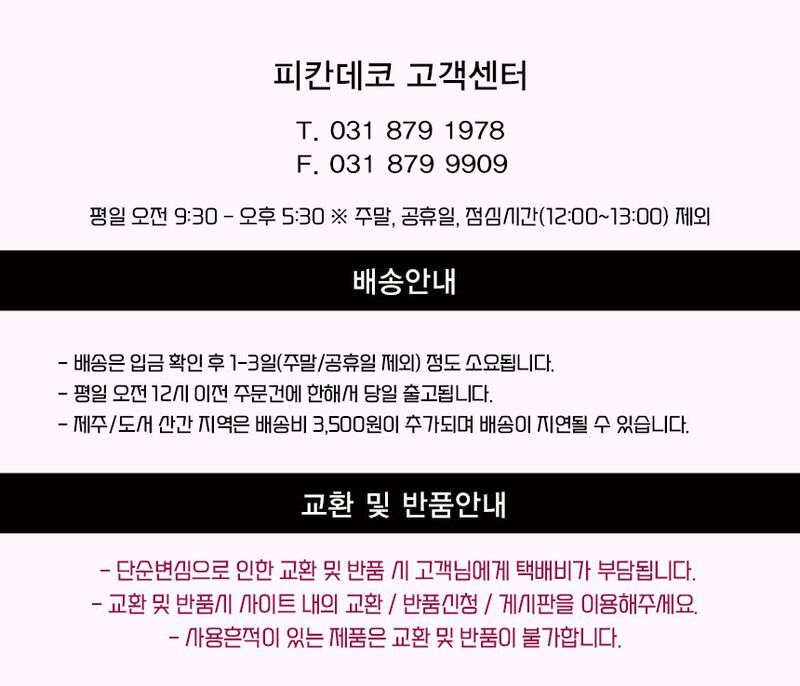 • 모든 규정은 전자상거래법에 의거하며, 택배사정으로 배송이 지연된 경우 재화를 공급받은 날로부터 7일 이내에 반품 가능합니다.
