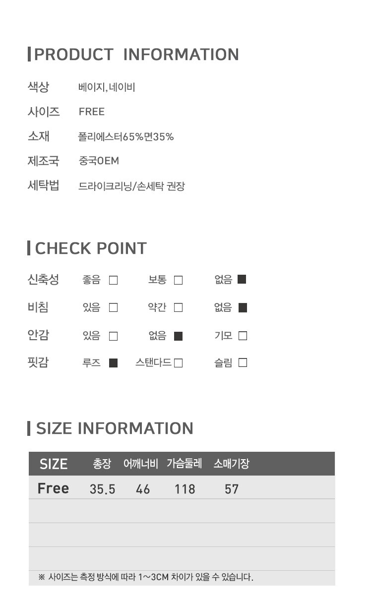 • 처음 배송된 상품상태와 다를 경우(세탁/착용 후 외출하신 경우) 반품이 불가합니다.
