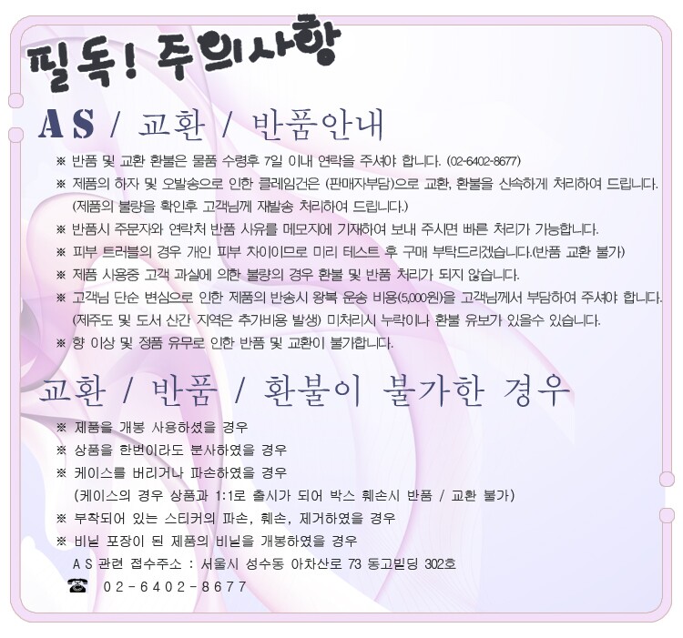 상품불량에 의한 반품, A/S, 품질보증 및 피해보상 등에 관한 사항은 소비자 분쟁해결기준(공정거래위원회 고시) 구매자가 미성년자인 경우에는 상품 구입시 법정대리인이 동의하지 아니하면 미성년자 본인 또는 법정대리인이 구매취소 할 수 있습니다. |