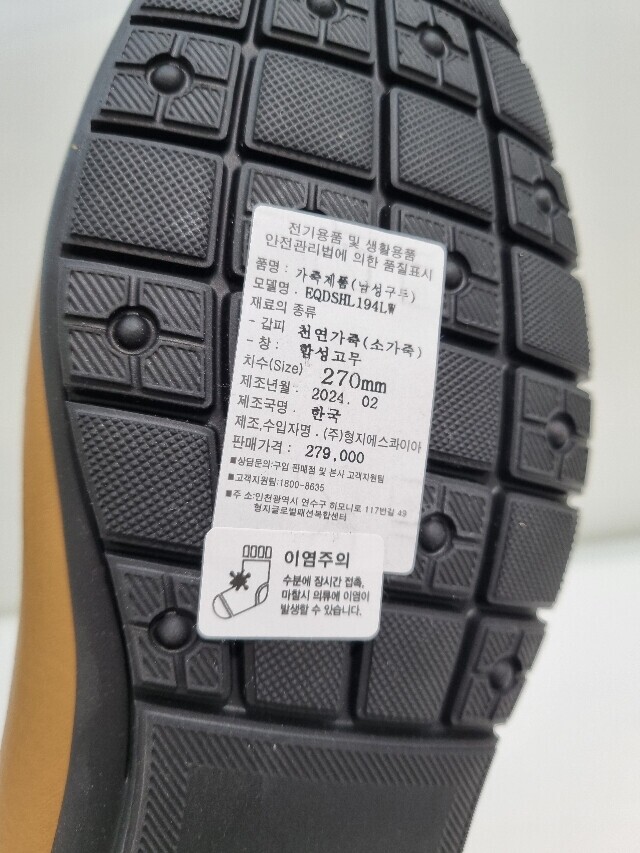 | 1. 제품 소재 (운동화인 경우에는 겉감, 안감을 구분하여 표시) | 소가죽 |