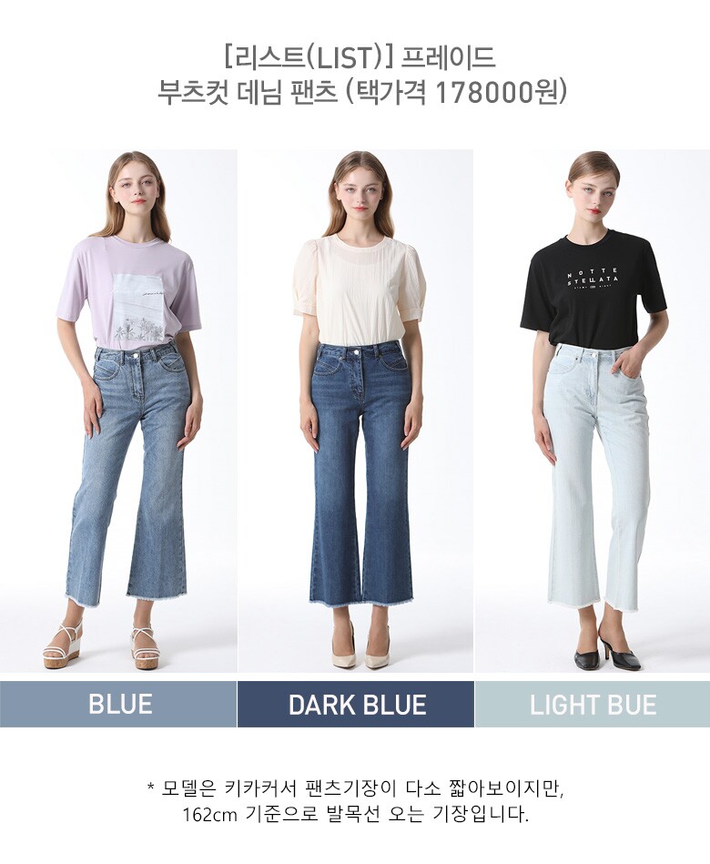 ▶ ITEM : 프레이드 부츠컷 데님 팬츠 ▶ NUMBER : TSMSLM62080 ▶ FABRIC : [겉감] 면 100% ▶ WASHING : 단독드라이(이염주의) ▶ 원 산 지 : 중 국 ▶ 색 상 : 라이트블루(LL),블루(BL),다크블루(DL)