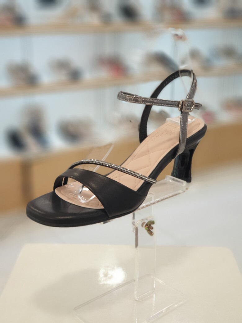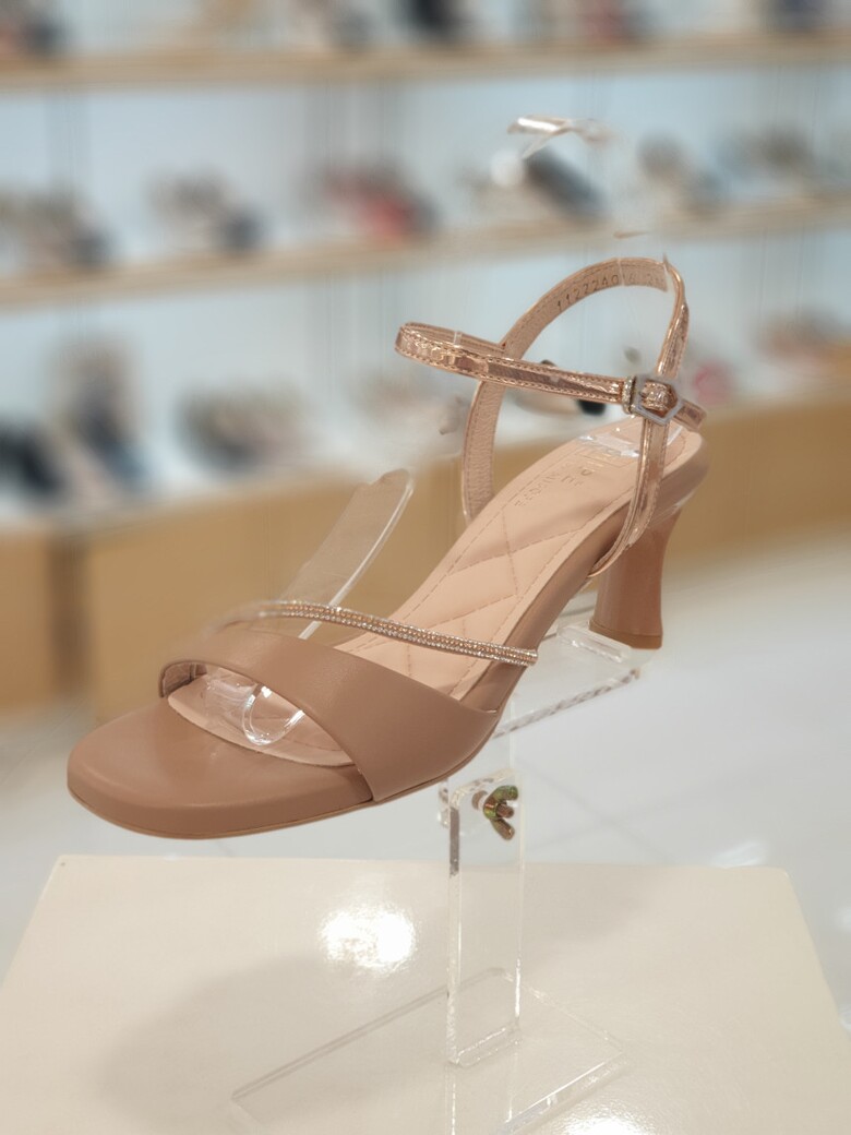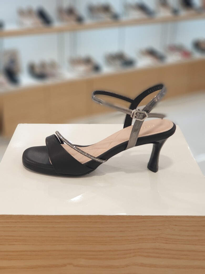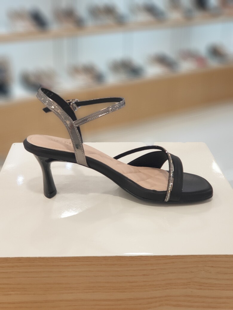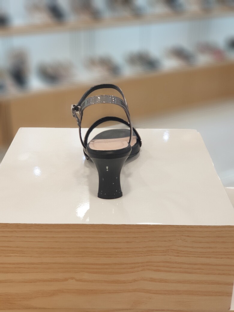 ▶ 핫픽스띠와 사선으로 감싸주는 앞갑피, 호일 소재가 여성스러운 느낌의 샌들