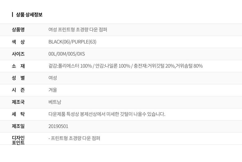 | 6. 세탁방법 및 취급시 주의사항 | 다운제품 특성상 봉제선상에서 미세한 깃털이 나올수 있습니다. |