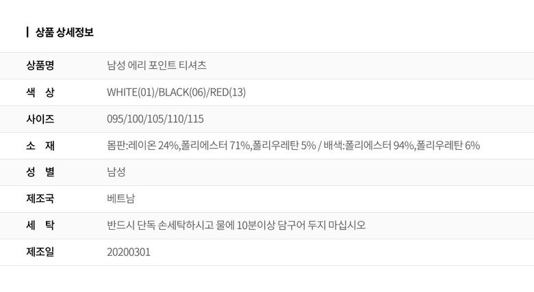 | 1. 제품 소재 (섬유의 조성 또는 혼용률을 백분율로 표시, 기능성인 경우 성적서 또는 허가서) | 몸판:레이온 24%,폴리에스터 71%,폴리우레탄 5% / 배색:폴리에스터 94%,폴리우레탄 6% |