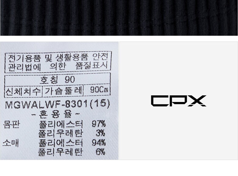 1. 제품 소재 (섬유의 조성 또는 혼용률을 백분율로 표시, 기능성인 경우 성적서 또는 허가서) | 몸판:폴리에스터 97%,폴리우레탄 3% / 소매:폴리에스터 94%,폴리우레탄 6% |