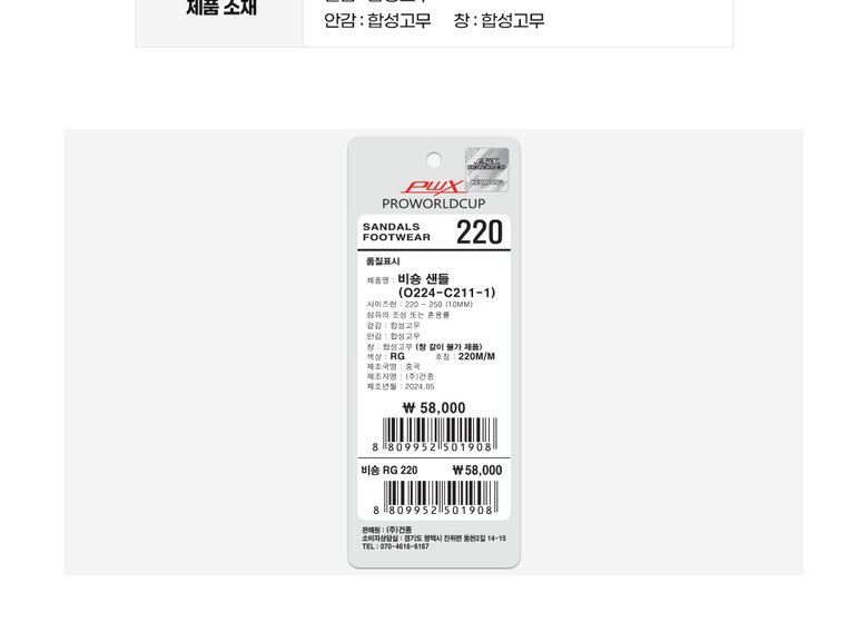 1. 제품 소재 (운동화인 경우에는 겉감, 안감을 구분하여 표시) | 겉감 EVA 배색 합성수지 창 EVA |