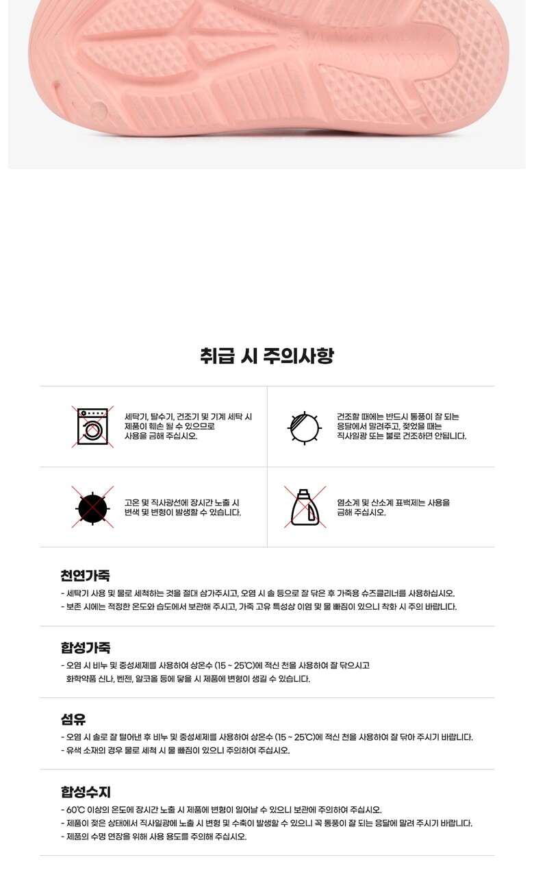 6. 취급시 주의사항 | 오염제거는 엷게 푼 세제를 부드러운 헝겊에 묻혀서 닦아주십시오. 세탁기 사용을 금합니다. 화기에 가까이하지 마세요. 오염 시 물 세척 후 통풍이 양호한 응달에서 건조 후 사용하세요. |