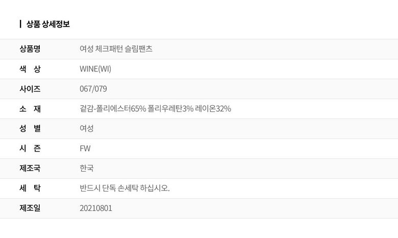 1. 제품 소재 (섬유의 조성 또는 혼용률을 백분율로 표시, 기능성인 경우 성적서 또는 허가서) 겉감-폴리에스터65% 폴리우레탄3% 레이온32%