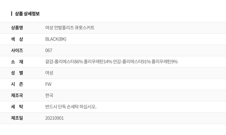 | 1. 제품 소재 (섬유의 조성 또는 혼용률을 백분율로 표시, 기능성인 경우 성적서 또는 허가서) | 겉감-폴리에스터86% 폴리우레탄14% 안감-폴리에스터91% 폴리우레탄9% |