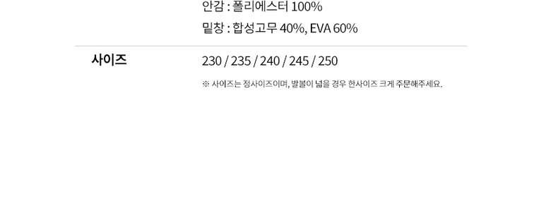 1. 제품 소재 (운동화인 경우에는 겉감, 안감을 구분하여 표시) | 겉감:합성피혁100%,안감:폴리에스터100%,밑창:합성고무40%EVA60% |