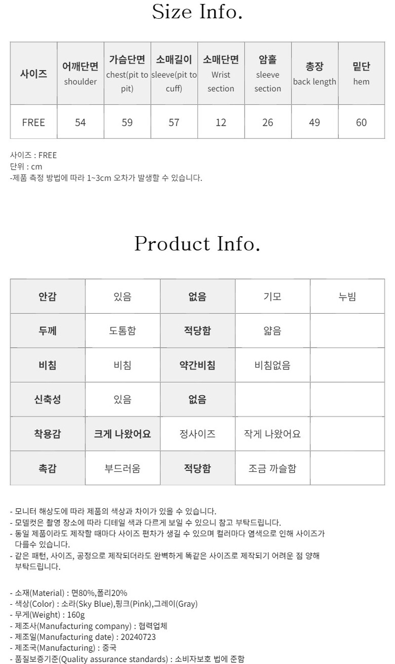 어깨단면 / 가슴단면 / 소매길이 / 소매단면 / 암홀 / 총장 / 밑단 (FREE)54 / 59 / 57 / 12 / 26 / 49 / 60