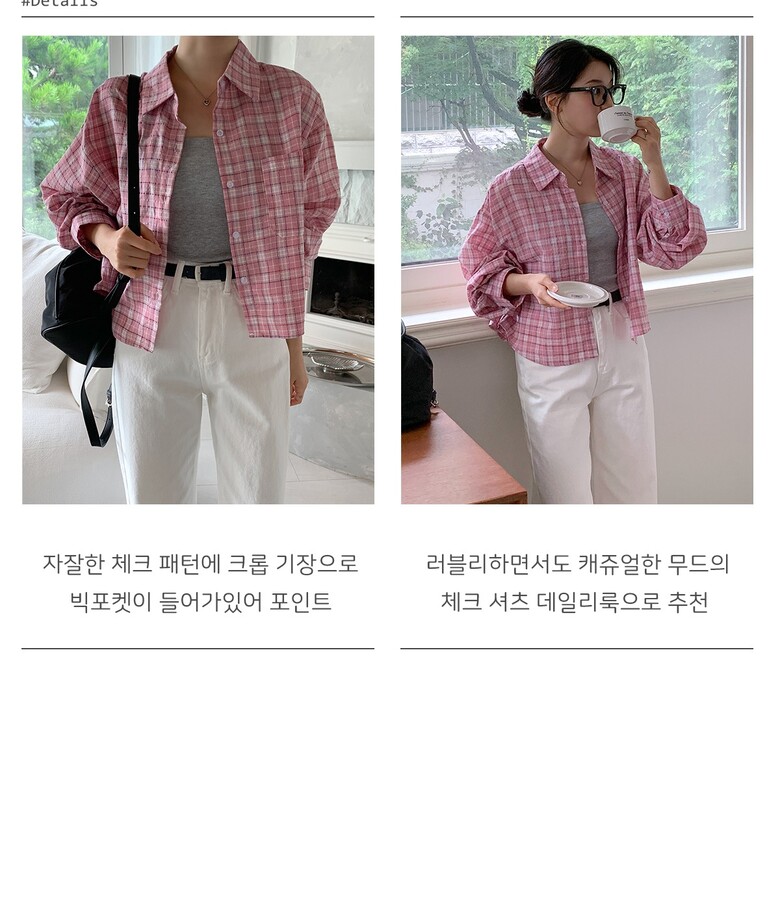 빅포켓이 들어가있어 포인트가 되며 자잘한 체크 패턴에 크롭 기장으로 러블리하면서도 캐쥬얼한 무드의 체크 셔츠 추천해드려요~! 컬러는 총 3가지 소라(Sky Blue),핑크(Pink),그레이(Gray)컬러로 준비했습니다. 사이즈는 FREE로 44~77사이즈까지 착용 가능합니다. ※같은 사이즈라도 체형에 따라 핏감이 조금씩 다를 수 있습니다. 상세사이즈를 확인하셔서 굿초이스해주세요 :) MD.SW