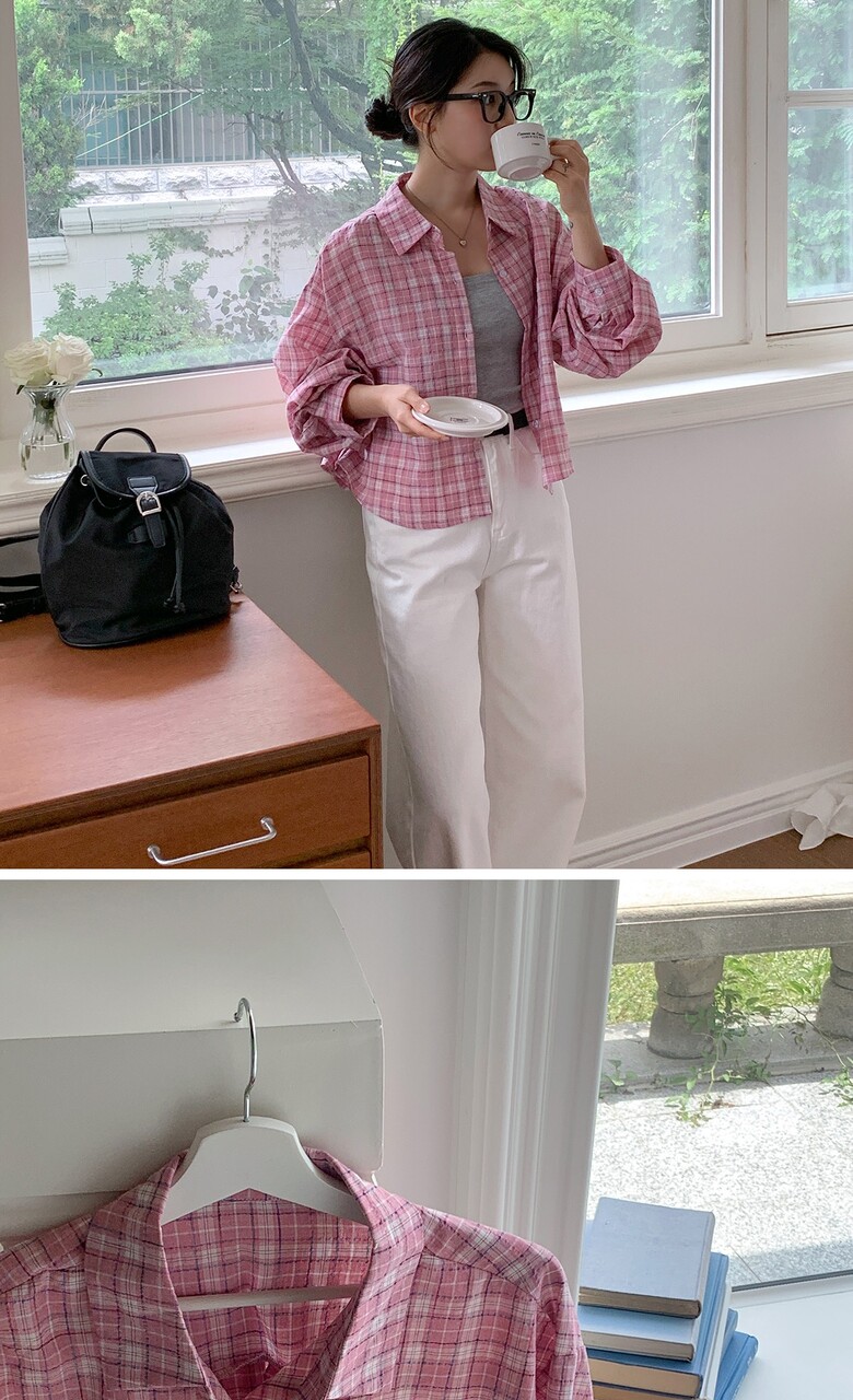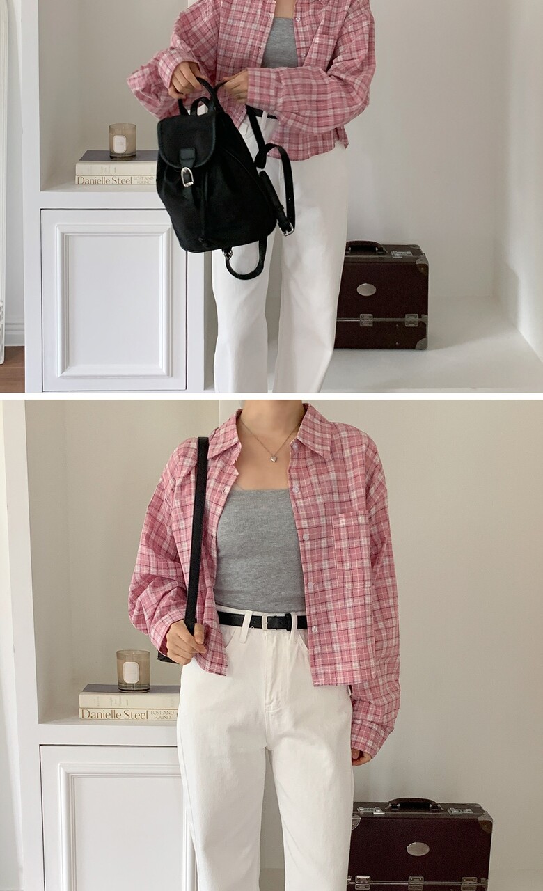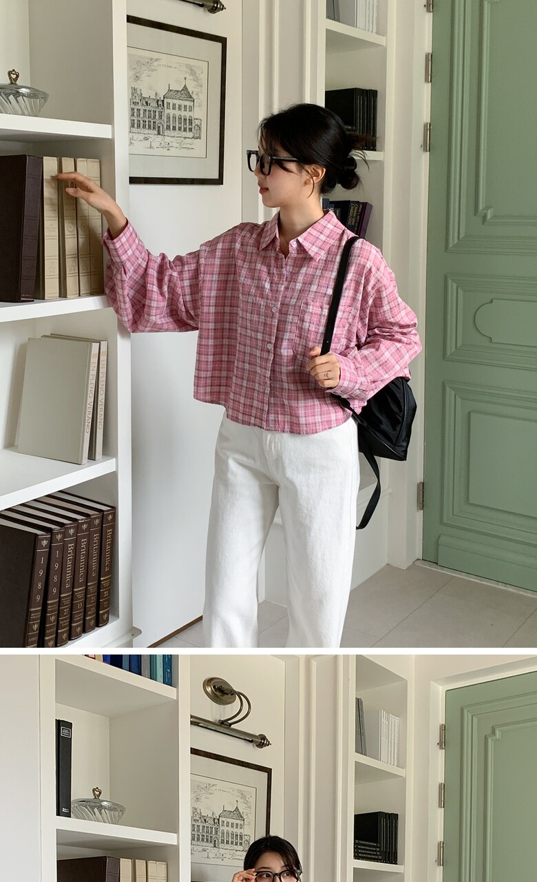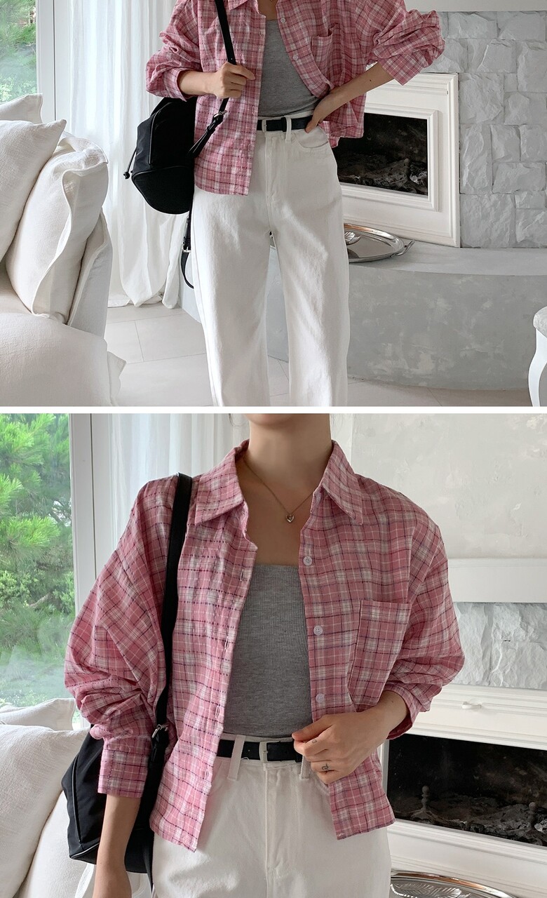 네쥬 여성 가을 기본 크롭 체크 포켓 데일리 긴팔 남방 셔츠