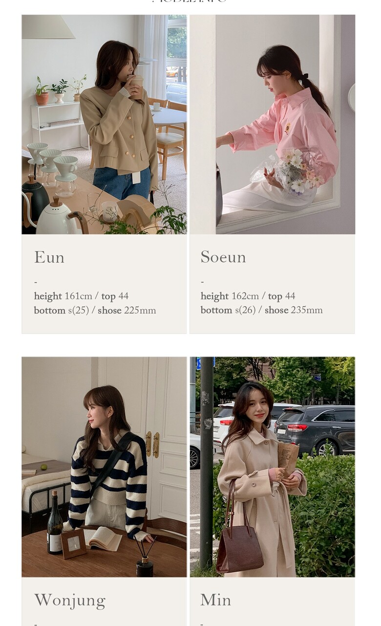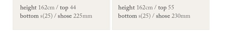 Top 44 / Bust 70A / Pants 26-27 / Height 162cm / Shoes 230 size