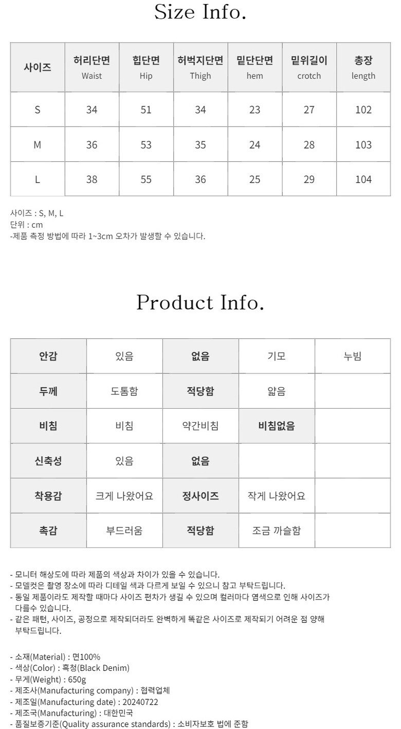 허리단면 / 힙단면 / 허벅지단면 / 밑단단면 / 밑위길이 / 총장 (S)34 / 51 / 34 / 23 / 27 / 102 (M)36 / 53 / 35 / 24 / 28 / 103 (L)38 / 55 / 36 / 25 / 29 / 104