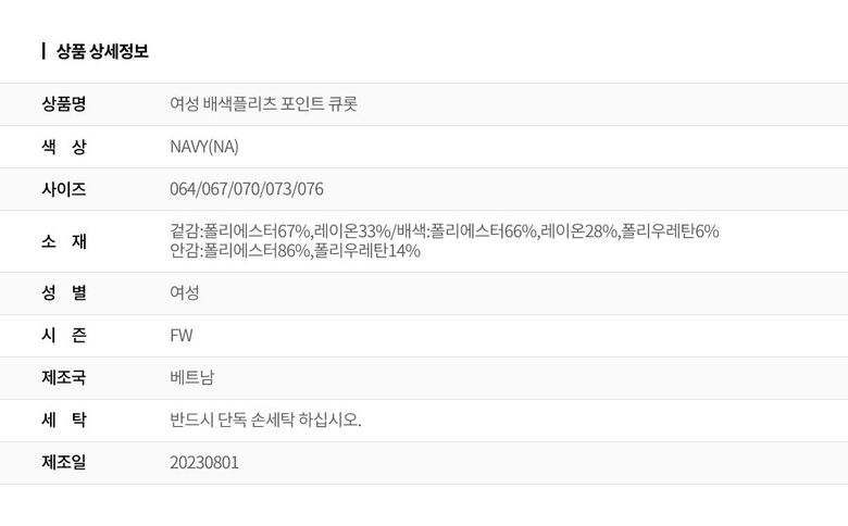 | 1. 제품 소재 (섬유의 조성 또는 혼용률을 백분율로 표시, 기능성인 경우 성적서 또는 허가서) | 겉감:폴리에스터67%,레이온33%/배색:폴리에스터66%,레이온28%,폴리우레탄6%/안감:폴리에스터86%,폴리우레탄14% |