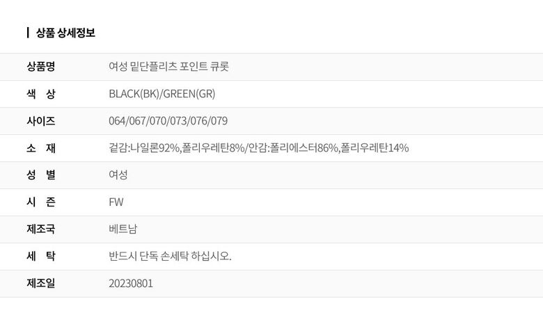 | 1. 제품 소재 (섬유의 조성 또는 혼용률을 백분율로 표시, 기능성인 경우 성적서 또는 허가서) | 겉감:나일론92%,폴리우레탄8%/안감:폴리에스터86%,폴리우레탄14% |