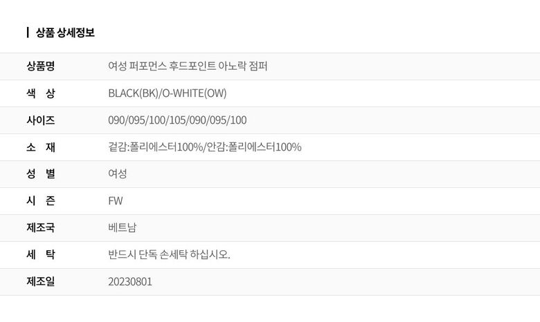 | 1. 제품 소재 (섬유의 조성 또는 혼용률을 백분율로 표시, 기능성인 경우 성적서 또는 허가서) | 겉감:폴리에스터100%/안감:폴리에스터100% |