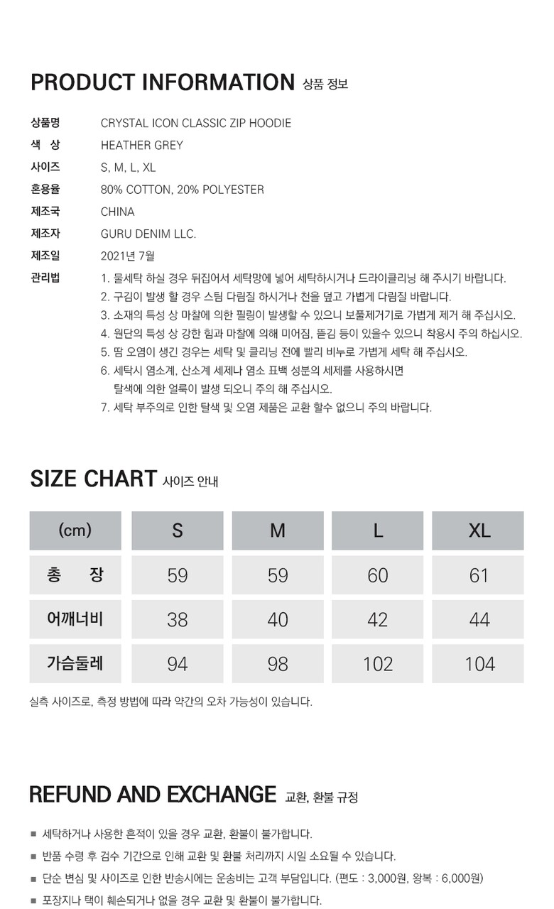 | 1. 제품 소재 (섬유의 조성 또는 혼용률을 백분율로 표시, 기능성인 경우 성적서 또는 허가서) | CRYSTAL ICON CLASSIC ZIP HOODIE |