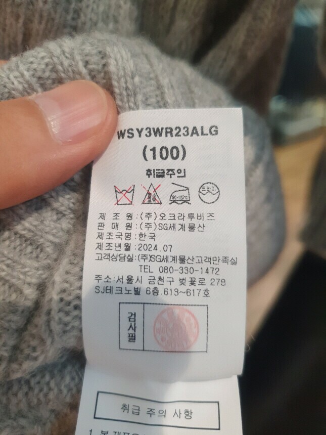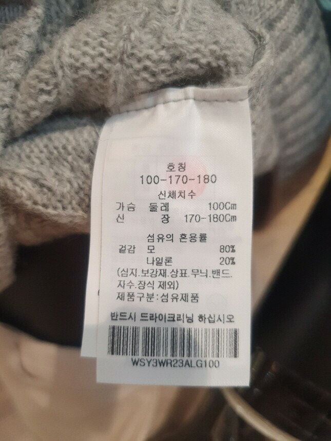 | 1. 제품 소재 (섬유의 조성 또는 혼용률을 백분율로 표시, 기능성인 경우 성적서 또는 허가서) | 겉감 : 모 79% , 나일론 21% (심지,보강재,상표,무늬,밴드,자수,장식 |