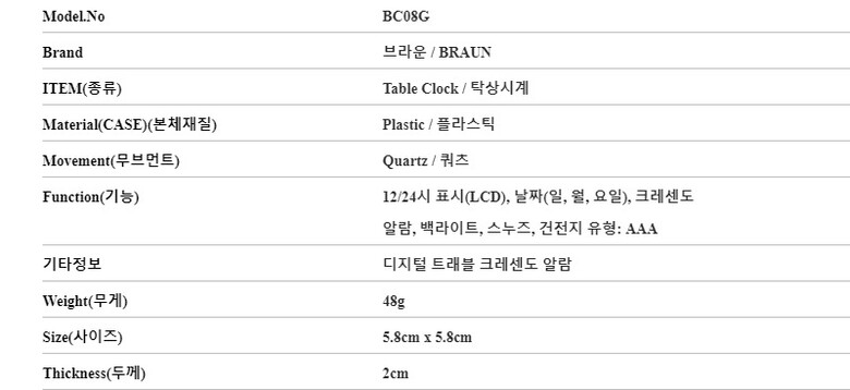 | 7. 주요 사양 | 플라스틱 탁상시계 쿼츠 |