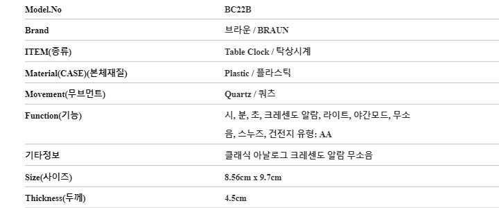 | 7. 주요 사양 | 플라스틱 탁상시계 쿼츠 |