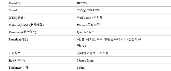 | 7. 주요 사양 | 플라스틱 벽시계 쿼츠 |