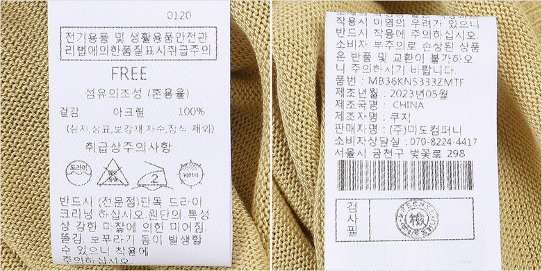 | 1. 제품 소재 (섬유의 조성 또는 혼용률을 백분율로 표시, 기능성인 경우 성적서 또는 허가서) | 겉감-아크릴100% |