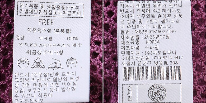 | 1. 제품 소재 (섬유의 조성 또는 혼용률을 백분율로 표시, 기능성인 경우 성적서 또는 허가서) | 겉감-아크릴100% |