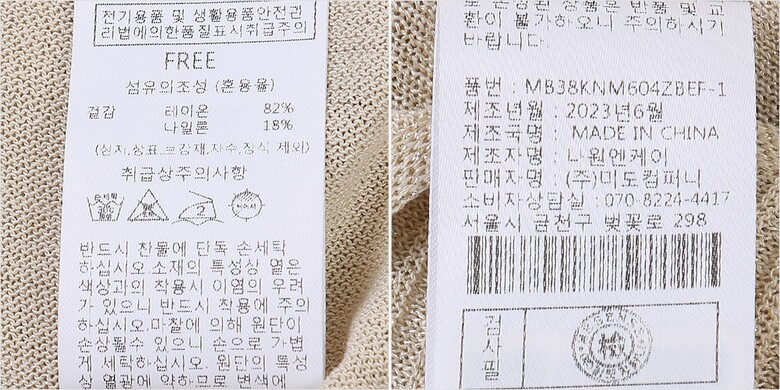 | 1. 제품 소재 (섬유의 조성 또는 혼용률을 백분율로 표시, 기능성인 경우 성적서 또는 허가서) | 겉감-나일론18% 레이온82% |