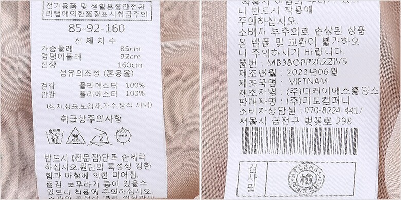 | 1. 제품 소재 (섬유의 조성 또는 혼용률을 백분율로 표시, 기능성인 경우 성적서 또는 허가서) | 겉감-폴리에스터100% 안감-폴리에스터100% |