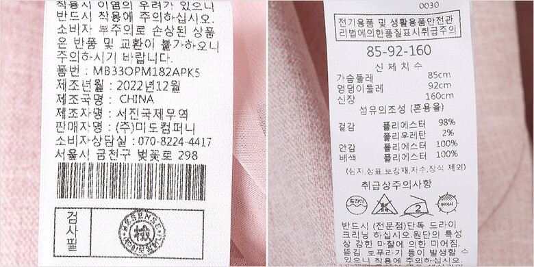 | 1. 제품 소재 (섬유의 조성 또는 혼용률을 백분율로 표시, 기능성인 경우 성적서 또는 허가서) | 겉감-폴리에스터98% 폴리우레탄2% 안감-폴리에스터100% 배색-폴리에스터100% |