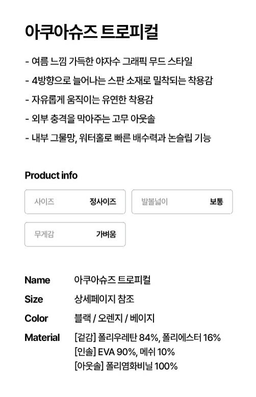 | 1. 제품 소재 (운동화인 경우에는 겉감, 안감을 구분하여 표시) | 상품상세참조 |