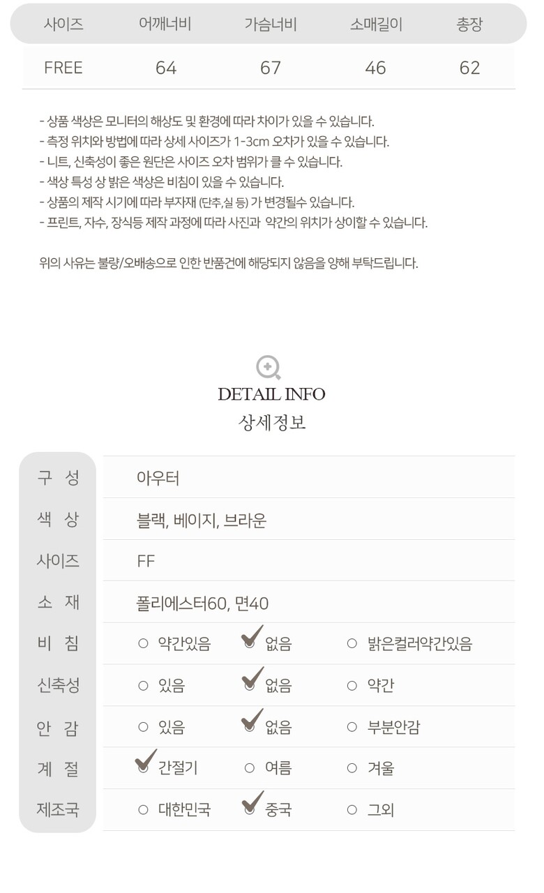 1. 제품 소재 (섬유의 조성 또는 혼용률을 백분율로 표시, 기능성인 경우 성적서 또는 허가서) | 상세페이지 참조 |