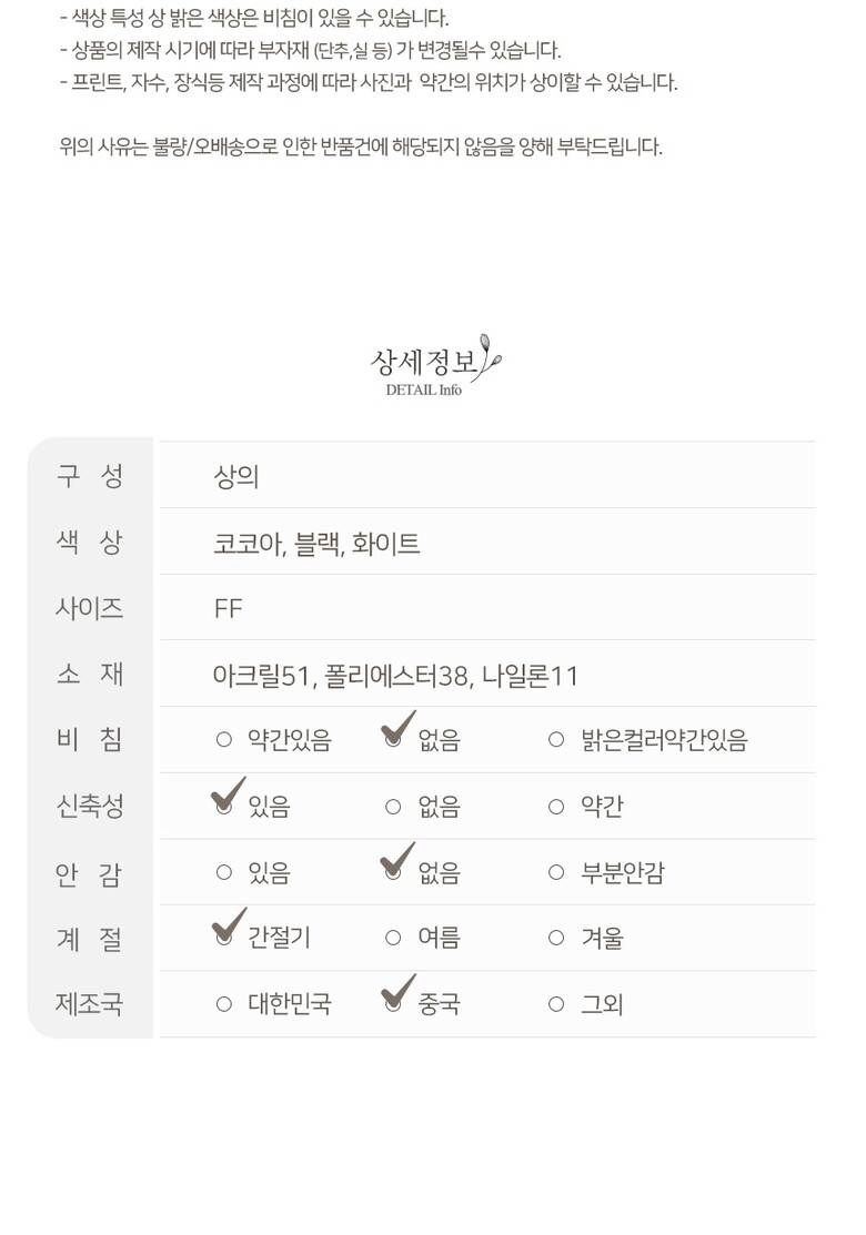 1. 제품 소재 (섬유의 조성 또는 혼용률을 백분율로 표시, 기능성인 경우 성적서 또는 허가서) | 상세페이지 참조 |