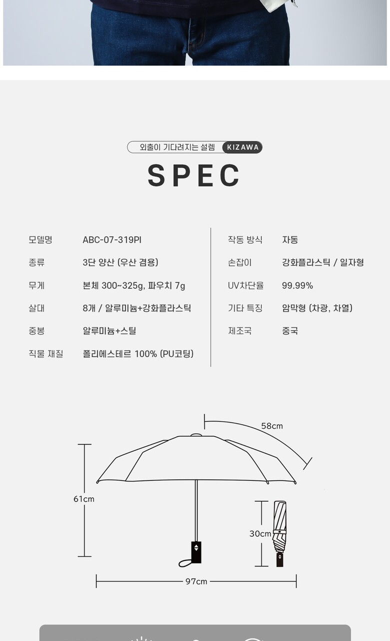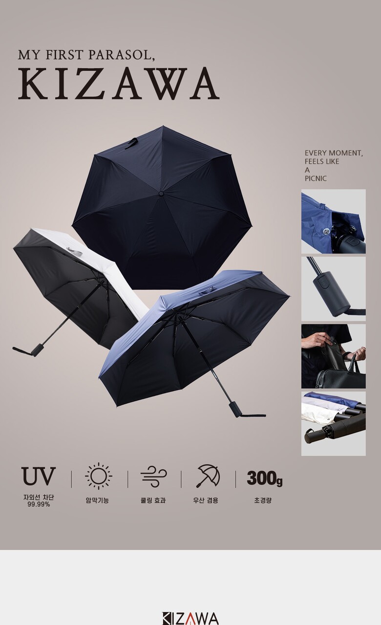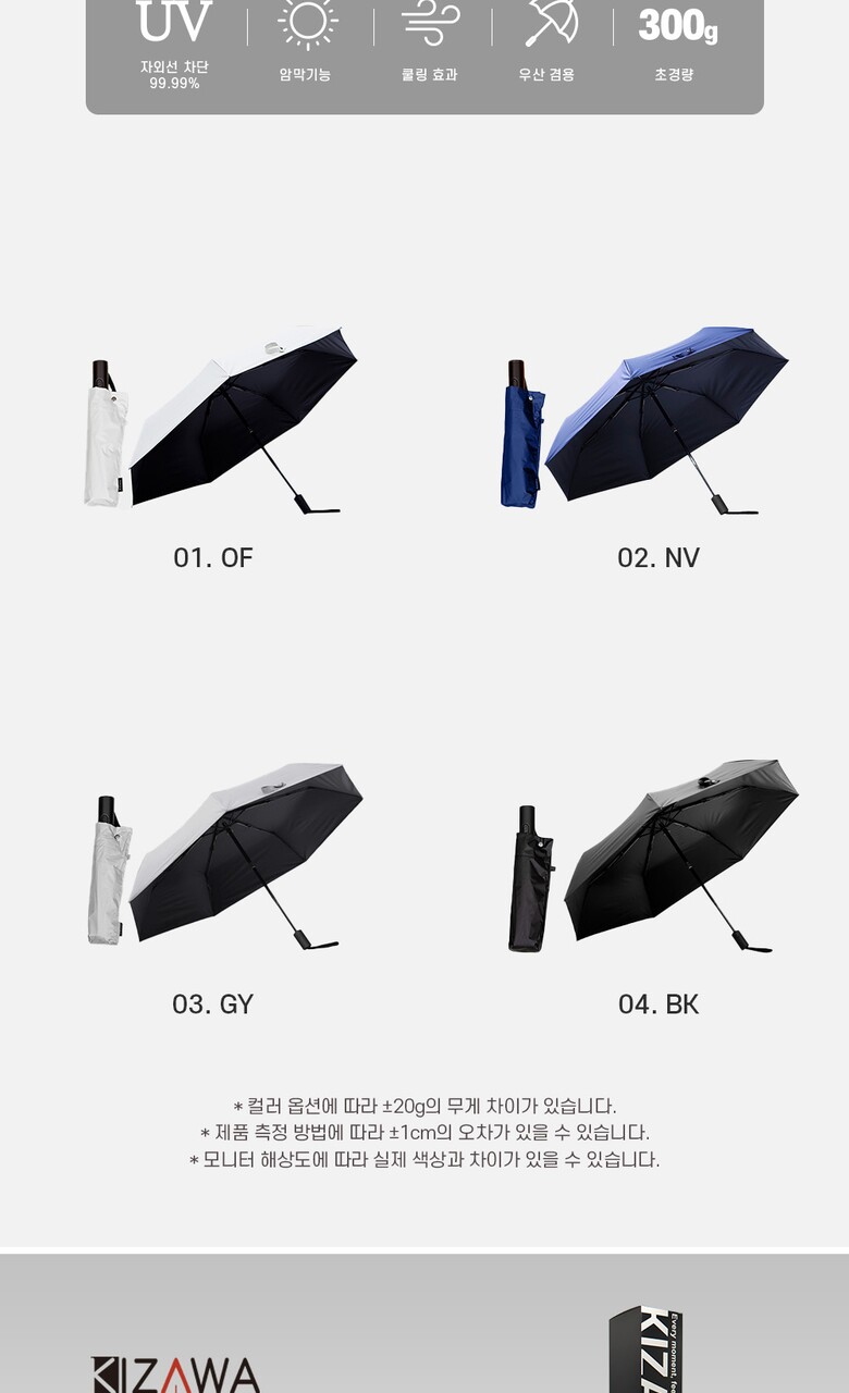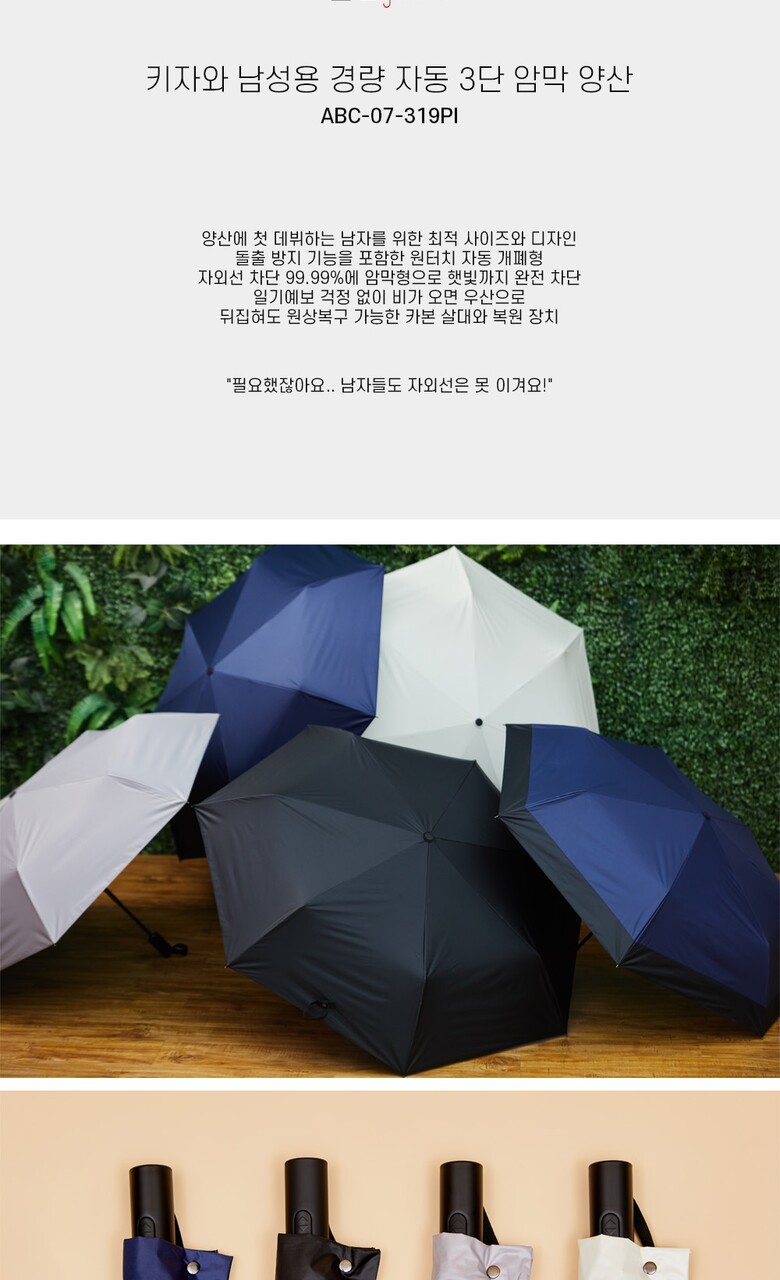 키자와 튼튼한 경량 자동 3단 암막 양산 (우양산/양우산) ABC-07-319PI