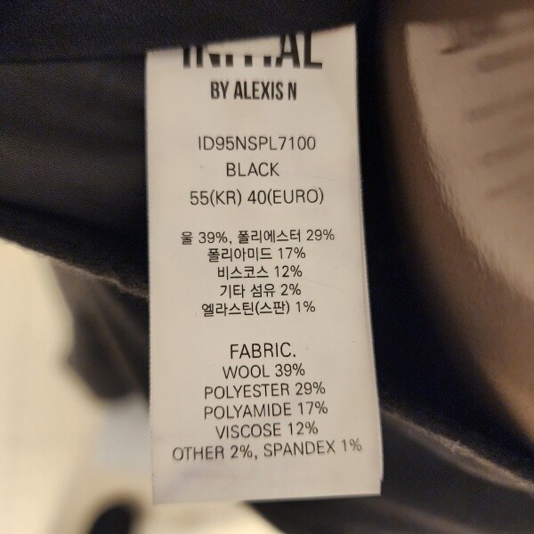 제품소재 : 울39%,폴리에스터29%,폴리아미드17%,비스코스12%,기타2%,스판1%