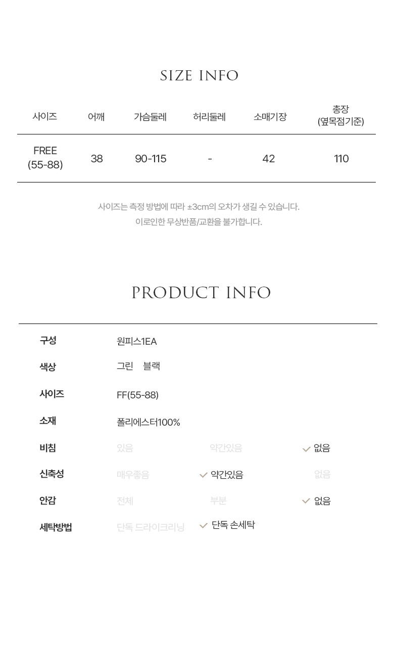 • 처음 배송된 상품상태와 다를 경우(세탁/착용 후 외출하신 경우) 반품이 불가합니다.