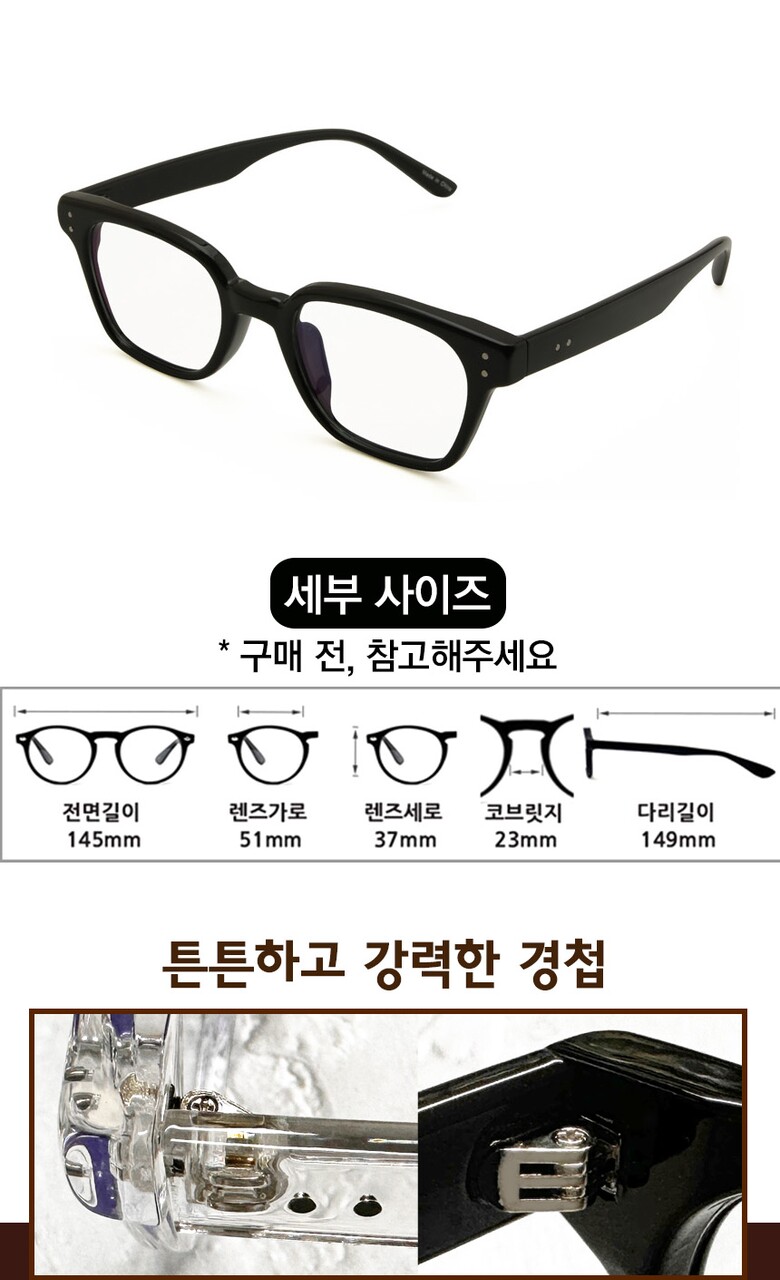 3. 치수 | 전면길이 145mm,렌즈가로 51mm,렌즈세로 37mm,코브릿지 23mm,다리길이 149mm |