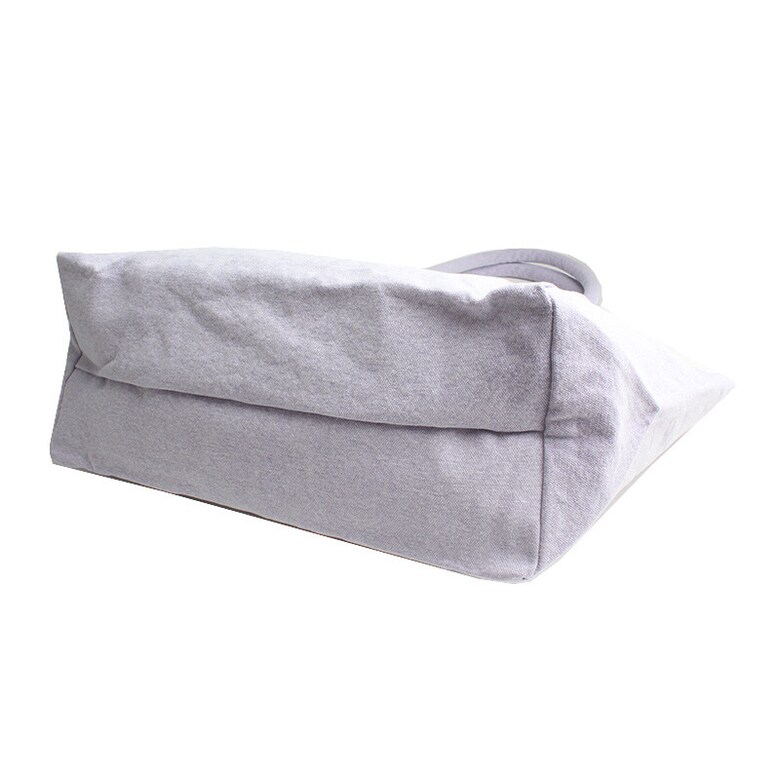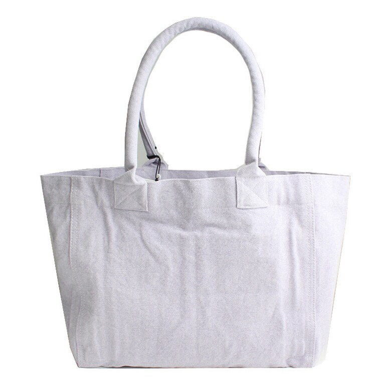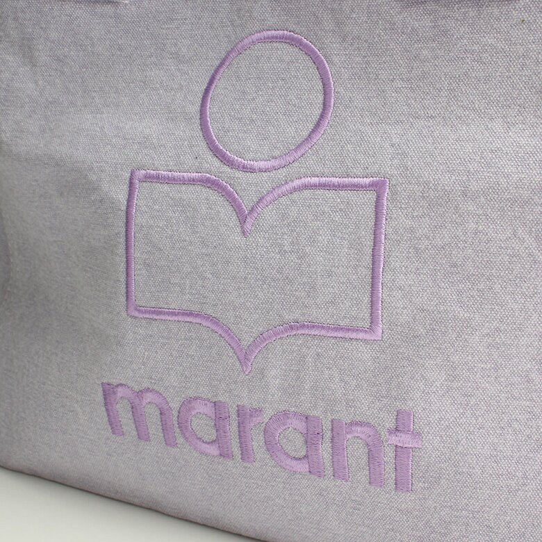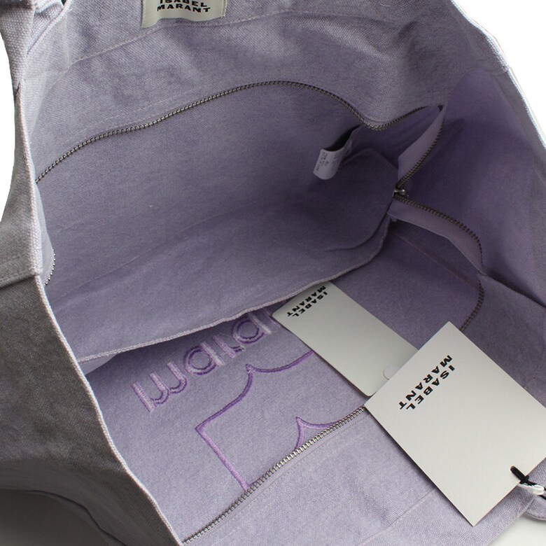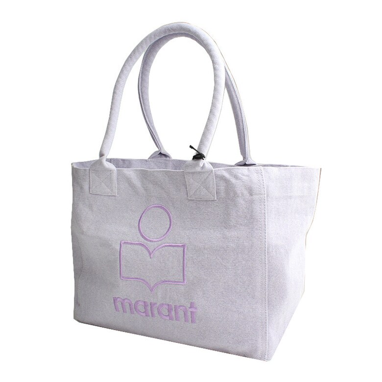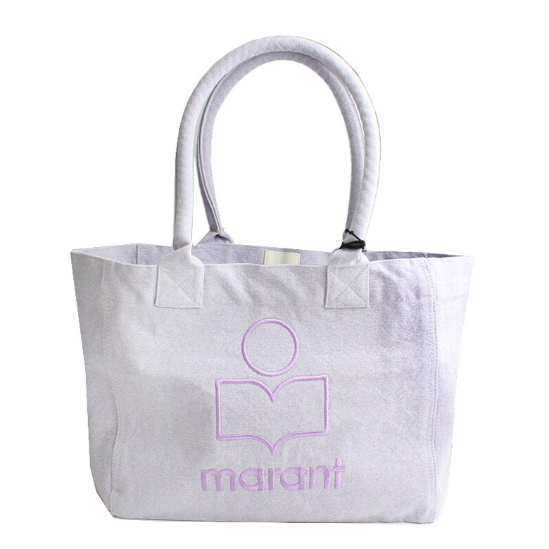 브랜드 로고 자수가 전면에 있는, 가볍고 실용적이며 환한 라일락 색감이 매력적인 쇼퍼백입니다.