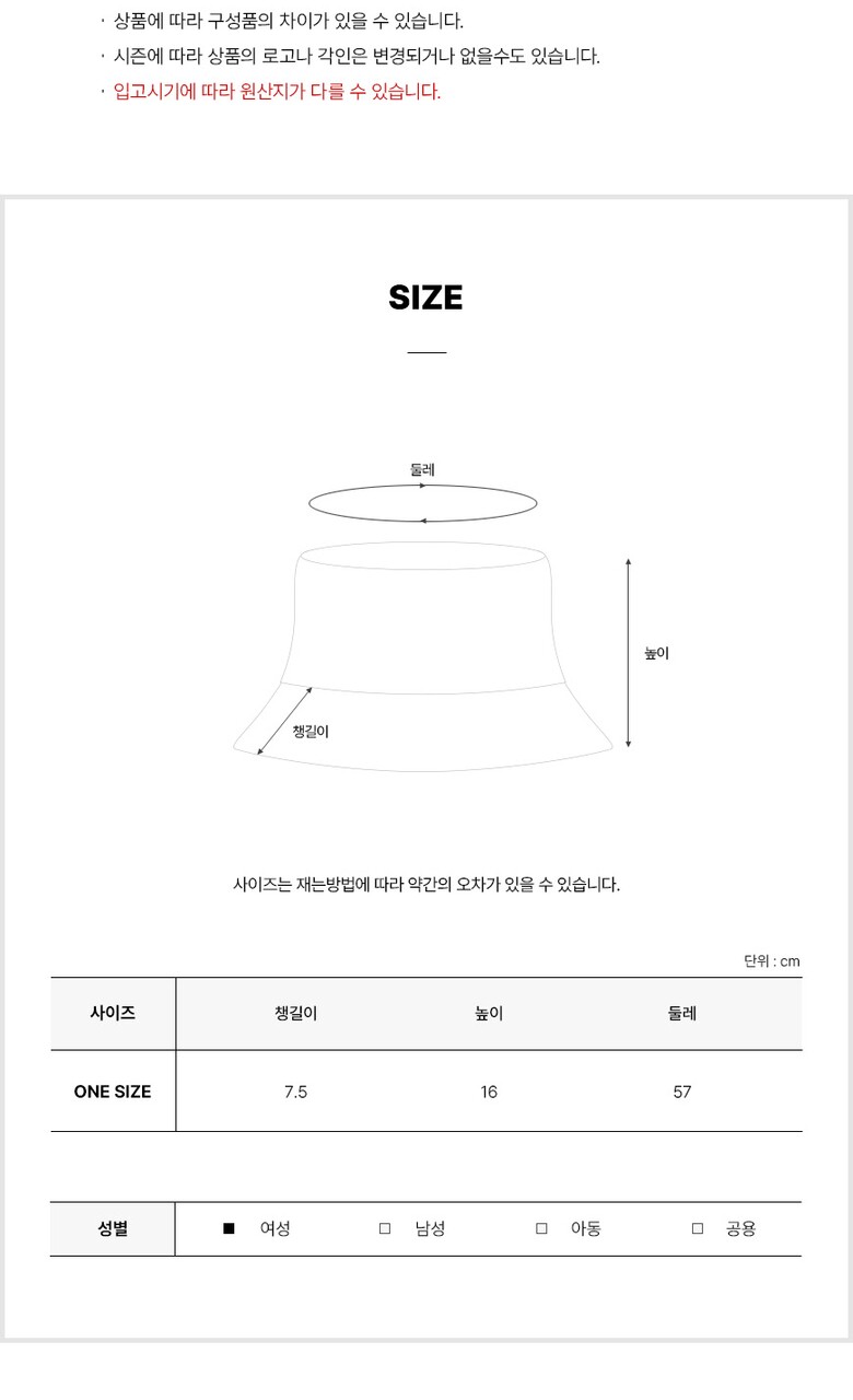 3. 치수 | 챙길이 7.5cm X 높이 16cm X 둘레 57cm |