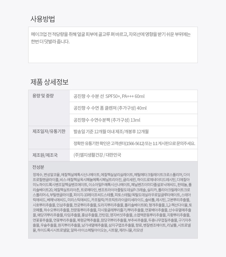 | 4. 사용방법 | 메이크업 전 적당량을 취해 얼굴 피부에 골고루 펴 바르고, 자외선에 영향을 받기 쉬운 부위에는 한번 더 덧발라 줍니다. |