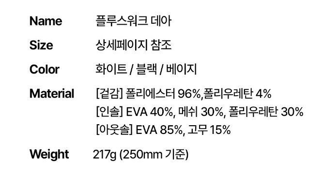 | 1. 제품 소재 (운동화인 경우에는 겉감, 안감을 구분하여 표시) | (갑피) Flyknit 90% + PU 10% (인솔) EVA 85% + RUBBER 15% (아웃솔) |