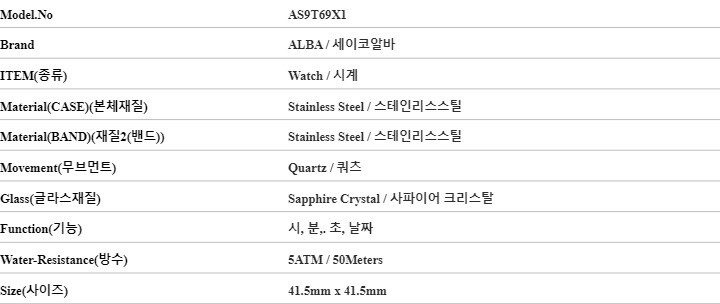 | 7. 주요 사양 | 스테인리스스틸 시계 쿼츠 |