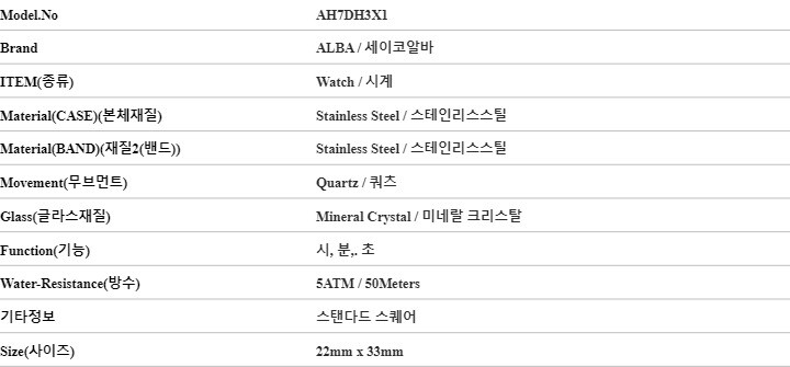 | 7. 주요 사양 | 스테인리스스틸 시계 쿼츠 |